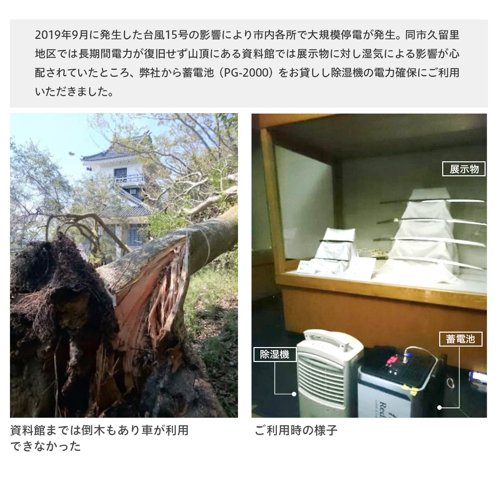 そこで当社取扱製品である非常用電源を千葉県内の自治体様へ事前に貸出しし、医療機器や資料保管に必要な除湿機の稼働、スマートフォンの充電など多岐にわたって活用していただきました。